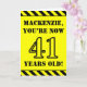 The front of this attention-grabbing and fun birthday-themed greeting card design features a personalized name and the message "YOU’RE NOW 41 YEARS OLD!" in black stencil look text on a yellow colored background. There is also an eye-catching yellow and black striped pattern at the top and bottom edges of the front. The inside features a customized birthday greeting message, or could perhaps be cleared and left blank if a message is to be written by hand instead. A customizable birthday card like this might be a fun way to acknowledge somebody’s forty first birthday. [~Z0000413]