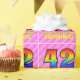 This fun and festive 42nd birthday themed wrapping paper design features a large number "42" having a colorful pattern inspired by the look of a rainbow spectrum. It also features the message "Happy 42nd Birthday,", and an editable name. The background features a cheerful pattern of dark pink and light pink stripes containing loving pink heart shapes. Birthday themed wrapping paper like this might be used when giving a gift or present in celebration of somebody’s forty second birthday. [~Z0000415]