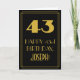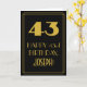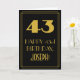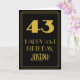 The front of this Roaring Twenties inspired birthday greeting card design features a large art deco style inspired number "43", the message "HAPPY 43rd BIRTHDAY,", an editable name, and a border pattern consisting of lines. The front also has a black-colored background. The inside features a customized birthday greeting message, or could perhaps be cleared and left blank if a message is to be written by hand instead. A birthday card like this might be a fun way to send birthday wishes to somebody who is celebrating their forty third birthday. [~Z0000502]