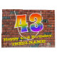 This colorful and fun birthday gift bag design, inspired by graffiti and street art, features a large number "43" with a rainbow spectrum gradient inspired pattern, along with the message "Happy 43rd Birthday,", and a custom name. It also has a brick wall inspired pattern background. A vibrant giftbag like this might be used when wrapping presents being given to somebody in celebration of their forty third birthday. [~Z0000522]