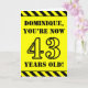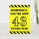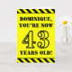 The front of this attention-grabbing and bold birthday-themed greeting card design features a personalized name and the message "YOU’RE NOW 43 YEARS OLD!" in black stencil look text on a yellow colored background. The front also features an eye-catching yellow and black stripes pattern at the top and bottom edges. The inside features an editable birthday greeting message, or could perhaps be cleared and left blank if a message is to be written by hand instead. A birthday card like this might be a fun way to send birthday wishes to somebody who is celebrating their forty third birthday. [~Z0000413]