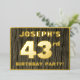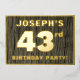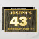 The front of this bold forty-third birthday party foil invitation card features a customizable name, a large number “43rd”, the message “BIRTHDAY PARTY!”, and a border, all in foil. The background of the front features a rustic, yet sophisticated, faux wood grain appearance inspired pattern. The back features personalized details about the event, such as the date, time, location, and any other information that may be useful. Personalized invitations like these might be used to invite guests to a birthday gathering being held to honor somebody’s 43rd birthday. [~Z0000598]