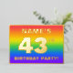 The front of this eye-catching and fun forty-third birthday celebration/party foil invitation card design features a custom name, a large number “43rd”, the message “BIRTHDAY PARTY!”, and a border. The background of the front has a joyful, colorful, rainbow spectrum inspired gradient pattern. The back features personalized details about the event, such as the date, time, place, and any other information that may be relevant. Personalized invitations like these might be a fun way to invite guests/attendees to a birthday party/gathering being held to celebrate somebody’s 43rd birthday. [~Z0000599]