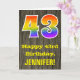 The front of this colorful yet rustic birthday-themed greeting card design features a large number "43" having a rainbow spectrum gradient inspired pattern. It also features the message "Happy 43rd Birthday,", and a customizable recipient name. The background of the front of the card features a rustic faux wood grain appearance pattern. The inside features a customized birthday greeting message, or could perhaps be cleared and left blank if a message is to be written by hand instead. A customizable birthday card like this might be a fun way to send birthday wishes to somebody who is celebrating their forty third birthday. [~Z0000419]