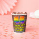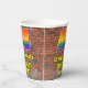 This fun and exciting urban street art and graffiti inspired birthday paper cup design features a large number “44” with a colorful rainbow spectrum gradient inspired pattern, along with the message “Happy 44th Birthday,”, and a custom name. The background has a brick wall pattern. Vibrant, colorful paper cups like this might be fun to use at a birthday party/celebration being held in celebration of somebody’s forty fourth birthday. [~Z0000543]