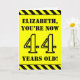 The front of this attention-grabbing and fun birthday themed greeting card design features a customizable name and the message "YOU’RE NOW 44 YEARS OLD!" in black stencil inspired text on a yellow colored background. The front also features an eye-catching yellow and black striped pattern at the top and bottom edges. The inside features a customizable birthday greeting message, or could perhaps be cleared and left blank if a message is to be written by hand instead. A custom birthday card like this might be a fun way to send birthday wishes to somebody who is celebrating their forty fourth birthday. [~Z0000413]