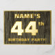The front of this bold forty-fourth birthday party foil invitation card features an editable name, a large number “44th”, the message “BIRTHDAY PARTY!”, and a border, all in foil. The background of the front features a rustic, yet sophisticated, faux wood grain look inspired pattern. The back features personalized details about the event, such as the date, time, venue, and any other information that may be important. Editable invitations like these might be used to invite guests/attendees to a birthday gathering/party being held in celebration of somebody’s 44th birthday. [~Z0000598]