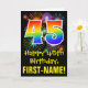 The front of this exciting, fun, and colorful birthday themed greeting card design features a large number "45" having a rainbow spectrum gradient inspired pattern. It also features the message "Happy 45th Birthday,", and a customizable recipient name. The front additionally features a colorful background pattern inspired by bursting celebratory fireworks. The inside features a customized birthday greeting message, or could perhaps be cleared and left blank if a message is to be written by hand instead. A personalized birthday card like this might be a fun way to celebrate somebody’s forty fifth birthday. [~Z0000442]