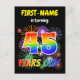 The front of this exciting and fun birthday party invitation postcard design has an editable name, a lively bursting celebratory fireworks inspired pattern, and the message "45 YEARS OLD!" having a colorful rainbow spectrum inspired gradient pattern. The back features an editable message with information about the party, such as when and where it is being held. Invitation postcards like this could be sent to potential attendees of a birthday party being held in celebration of somebody’s forty fifth birthday. [~Z0000452]