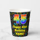 This exciting and fun music-themed birthday paper cup design features a large number “45” having a rainbow spectrum gradient inspired pattern. It also features the message “Happy 45th Birthday,”, and an editable name. The background features a multicolored pattern having music notes and symbols of various colors and sizes. Vibrant, colorful paper cups like this might be fun to use at a birthday party being held to celebrate somebody’s forty fifth birthday. [~Z0000541]