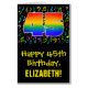 The front of this vibrant, joyful, and fun birthday-themed greeting card design features a large number “45” with a rainbow spectrum gradient inspired pattern, along with the message “Happy 45th Birthday,”, and an editable recipient name. The front additionally features an exciting and colorful music notes and symbols inspired background pattern. The inside features a customizable birthday greeting message, or could perhaps be cleared and left blank if a message is to be written by hand instead. A customizable birthday card like this might be a fun way to send a message in celebration of somebody’s forty fifth birthday. [~Z0000527]