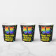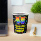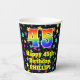 This joyful and exciting birthday paper cup design features a large number “45” having a rainbow spectrum gradient inspired pattern. It also features the message “Happy 45th Birthday,”, and a customizable name. The background features a multicolored pattern featuring many star shapes with different colors and sizes. Colorful, vibrant paper cups like this might be fun to have at a birthday party/celebration being held to honor somebody’s 45th birthday. [~Z0000540]