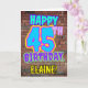 The front of this fun birthday themed greeting card design features the message “HAPPY 45TH BIRTHDAY,” having a vibrant, colorful, graffiti-inspired look, plus an editable recipient name. The background of the front features a pattern inspired by the look of a brick wall. The inside has a personalized birthday greeting message, or could perhaps be cleared and left blank if a message is to be written by hand instead. A fun, customized birthday greeting card like this might be sent in celebration of somebody’s forty-fifth birthday. [~Z0000531]