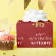 This luxurious and elegant birthday themed wrapping paper design features the message "HAPPY 46th BIRTHDAY,", an editable name, and the birthday number "46th" having a faux/imitation gold inspired appearance pattern. The background is colored red. Wrapping paper like this might be used when wrapping gifts that are being given to celebrate somebody’s 46th birthday. [~Z0000491]