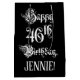 This luxurious and formal birthday-themed gift bag design features the message “Happy 46th Birthday,” in elaborate script style text, on a black colored background. It also features an editable recipient name. A birthday themed gift-bag like this might be used when giving a gift or present in celebration of somebody’s 46th birthday. [~Z0000557]