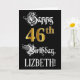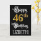 The front of this ornate and formal birthday greeting card design features the message “Happy 46th Birthday,”, and an editable recipient name. Part of the message is in an opulent script-style text, the large number “46th” features a faux/imitation gold-inspired look pattern, and the background is colored black. The inside has an editable birthday greeting message, or could perhaps be cleared and left blank if a message is to be written by hand instead. An elaborate, customizable birthday greeting card like this might be used to celebrate somebody’s forty-sixth birthday. [~Z0000559]