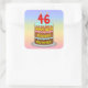 This joyful and colorful birthday square sticker design features a cartoon-style depiction of a three-tier birthday cake having numeral-shaped candles on top showing the number “46“, along with the message “HAPPY 46TH BIRTHDAY,”, and a personalized recipient name. The background features a multi-color pastel rainbow spectrum inspired gradient pattern. Stickers like these might be used when celebrating somebody’s forty sixth birthday. [~Z0000624]