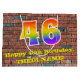 This vibrant and fun birthday themed gift bag design, inspired by street art and graffiti, features a large number "46" with a rainbow spectrum gradient inspired pattern, along with the message "Happy 46th Birthday,", and a customizable name. The background features a brick wall style pattern. A colorful birthday themed giftbag like this might be a fun way to wrap a gift or present being given to somebody who is celebrating their 46th birthday. [~Z0000522]