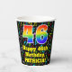 This exciting and colorful music-themed birthday paper cup design features a large number “46” with a rainbow spectrum gradient inspired pattern, along with the message “Happy 46th Birthday,”, and an editable name. The background features a multicolored pattern of various music notes and symbols having a variety of colors and sizes. Vibrant, colorful paper cups like this might be fun to use at a birthday celebration being held to celebrate somebody’s forty sixth birthday. [~Z0000541]