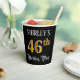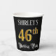 This fancy and elegant birthday themed paper cup design features an editable name and the message “46th Birthday Party”. The large number “46th” has a faux/imitation gold-inspired coloring pattern, and the words “Birthday Party” are in opulent script-style text. The background is colored black by default (although it can be customized). Luxurious, opulent paper cups like this might be useful to have at a birthday celebration being held in celebration of somebody’s 46th birthday. [~Z0000567]