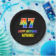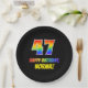 This cheerful, colorful, and fun birthday themed paper plate design features a large number "47" and the message "HAPPY BIRTHDAY,", both colored with a rainbow spectrum gradient inspired pattern, along with a bold yellow personalized name. The background is colored black. Fun, customizable birthday themed paper plates like this might be used at somebody’s 47th birthday celebration. [~Z0000488]