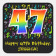 This fun, vibrant, and colorful birthday themed sticker design features a large number "47" having a rainbow spectrum gradient inspired pattern. It also features the message "Happy 47th Birthday,", and a personalized name. Part of the background features a pattern of various music notes and symbols having a variety of colors and sizes. Fun, editable birthday stickers like this might be used as a birthday party decoration, or perhaps given as a birthday present, or perhaps be used when wrapping birthday gifts being given to celebrate a singer’s, a musician’s, a song composer’s, or somebody else’s 47th birthday. [~Z0000423]