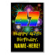 The front of this vibrant, colorful, and fun birthday themed greeting card design features a large number “47” having a rainbow spectrum gradient inspired pattern. It also features the message “Happy 47th Birthday,”, and a personalized recipient name. The front additionally has an exciting and colorful background pattern inspired by the look of bursting celebratory fireworks. The inside features a custom birthday greeting message, or could perhaps be cleared and left blank if a message is to be written by hand instead. A personalized birthday card like this might be a fun way to acknowledge somebody’s forty seventh birthday. [~Z0000526]