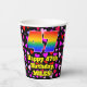 This joyful and happy birthday themed paper cup design features a large number “47” having a rainbow spectrum gradient inspired pattern. It also features the message “Happy 47th Birthday,”, and a customizable name. The background features a pattern of heart shapes with colors like purple, pink, and red. Cheerful, friendly paper cups like this might be fun to have at a birthday party/celebration being held to honor somebody’s 47th birthday. [~Z0000548]