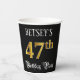 This elegant and luxurious birthday paper cup design features a custom name and the message “47th Birthday Party”. The large number “47th” has an imitation/faux gold-inspired coloring pattern, and the words “Birthday Party” are in ornate script-style text. The background is colored black by default (although it can be customized). Ornate, fancy paper cups like this might be used at a birthday celebration/party being held to honor somebody’s forty seventh birthday. [~Z0000567]