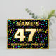 The front of this vibrant forty-seventh birthday party foil invitation card design features a customizable name, a large number “47th”, the message “BIRTHDAY PARTY!”, and a border. The background of the front has a joyful, multicolored starfield pattern. The back features personalized details about the event, such as the date, time, place, and any other useful information. Customizable invitations like these might be a fun way to invite attendees to a birthday party being held in celebration of somebody’s 47th birthday. [~Z0000600]