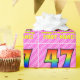 This upbeat and fun 47th birthday-themed wrapping paper design features a large number "47" having a colorful pattern inspired by the appearance of a rainbow spectrum. It also features the message "Happy 47th Birthday,", followed by a personalized name. The background features a pattern of light pink and dark pink stripes containing loving pink heart shapes. Birthday themed wrapping paper like this might be a fun way to wrap a gift or present being given to celebrate somebody’s forty seventh birthday. [~Z0000415]