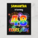 The front of this exciting and vibrant birthday party invitation postcard design has a personalized name, a fun bursting celebratory fireworks inspired pattern, and the message "48 YEARS OLD!" having a colorful rainbow spectrum inspired gradient pattern. The back features a personalized message with information about the party, such as when and where it is being held. Invitation postcards like this could be sent to potential attendees of a birthday party being held to celebrate somebody’s forty eighth birthday. [~Z0000452]