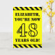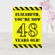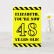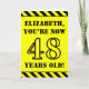 The front of this attention-grabbing and bold birthday-themed greeting card design features a personalized name and the message "YOU’RE NOW 48 YEARS OLD!" in black stencil look text on a yellow colored background. The front also features an eye-catching yellow and black stripes pattern at the top and bottom edges. The inside features a custom birthday greeting message, or could perhaps be cleared and left blank if a message is to be written by hand instead. A personalized birthday card like this might be a fun way to send birthday wishes to somebody who is celebrating their forty eighth birthday. [~Z0000413]
