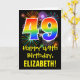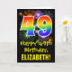 The front of this fun, colorful, and exciting birthday-themed greeting card design features a large number "49" having a rainbow spectrum gradient inspired pattern. It also features the message "Happy 49th Birthday,", and an editable recipient name. The front additionally features a colorful background pattern inspired by the look of bursting celebratory fireworks. The inside features a personalized birthday greeting message, or could perhaps be cleared and left blank if a message is to be written by hand instead. A customizable birthday card like this might be a fun way to send a message celebrating somebody’s forty ninth birthday. [~Z0000442]