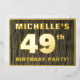 The front of this bold forty-ninth birthday party/celebration foil invitation card features a custom name, a large number “49th”, the message “BIRTHDAY PARTY!”, and a border, all in foil. There is a rustic, yet sophisticated, faux wood grain appearance inspired pattern for the background of the front. The back features personalized details about the event, such as the date, time, venue/place, and any other information that may be important. Customized invitations like these might be used to invite guests to a birthday party being held in celebration of somebody’s 49th birthday. [~Z0000598]