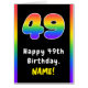 This bold and vibrant birthday-themed greeting card design features the number “49“ having a multicolored rainbow spectrum inspired gradient pattern, along with the message “Happy 49th Birthday,”, and an editable recipient name. The inside has a customizable birthday greeting message, or could perhaps be cleared and left blank if a message is to be written by hand instead. A fun, customizable birthday greeting card like this might be given to celebrate somebody’s forty-ninth birthday. [~Z0000628]