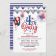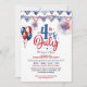 4th of July Modern Calligraphy Independence party invitation to celebrate freedom with your friends and family. The design features firecrackers, balloons, bunting flag - all in the theme of red, blue and white. The reverse side has blue stripes. The text is easily customizable.