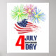 4 July & Independence Day on the bottom. Above that is three fireworks bursts and a tattered flag.