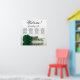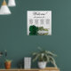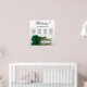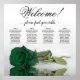 This stunning wedding seating chart has four tables with 10 seats per table, accommodating a total of 40 guests. The chart is adorned with a sophisticated and romantic design, featuring a single long-stemmed rose in a rich deep emerald green color, delicately resting on its side and casting a reflection in a serene pool of water. The chart's title, written in graceful script calligraphy, warmly welcomes guests with "Welcome! Please find your table" while leaving ample space below for the names of the couple and wedding date. This elegant seating chart serves as a charming and practical way to greet and assist your guests in finding their designated seats at your wedding reception.
