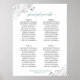 This beautiful 4 table wedding seating chart includes table assignments for 40 guests, with 10 people at each table. The design is simple yet elegant with gray and teal or turquoise text on a white background and features lacy floral filigree in the corners and a fancy script calligraphy title reading "please find your table." Sophisticated and chic.