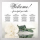 This stunning wedding seating chart has four tables with 10 seats per table, accommodating a total of 40 guests. The chart is adorned with a sophisticated and romantic design, featuring a single long-stemmed rose in an ivory, white, or pale cream color, delicately resting on its side and casting a reflection in a serene pool of water. The chart's title, written in graceful script calligraphy, warmly welcomes guests with "Welcome! Please find your table" while leaving ample space below for the names of the couple and wedding date. This elegant seating chart serves as a charming and practical way to greet and assist your guests in finding their designated seats at your wedding reception.