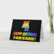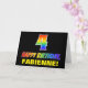 The front of this cheerful, fun, and colorful birthday-themed greeting card design features a large number "4" and the message "HAPPY BIRTHDAY,", both having a rainbow spectrum gradient inspired pattern coloring, along with a bold yellow editable recipient name. The front also has a simple black colored background. The inside has a custom birthday greeting message, or could perhaps be cleared and left blank if a message is to be written by hand instead. A cheerful customizable birthday card like this might be a fun way to send a message celebrating somebody’s fourth birthday. [~Z0000472]