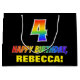 This cheerful, fun, and colorful birthday gift bag design features a large number "4" and the message "HAPPY BIRTHDAY,", both colored with a rainbow spectrum gradient inspired pattern, along with a bold yellow editable recipient name. The background is colored black. A fun gift bag like this might be used when wrapping presents being given to somebody in celebration of their fourth birthday. [~Z0000477]