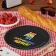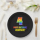This fun, colorful, and cheerful birthday themed paper plate design features a large number "4" and the message "HAPPY BIRTHDAY,", both having a rainbow spectrum gradient inspired pattern coloring, along with a bold yellow personalized name. The background is colored black. Fun, editable birthday themed paper plates like this might be used at somebody’s 4th birthday party. [~Z0000488]