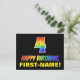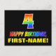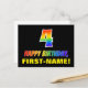 The front of this colorful, fun, and cheerful birthday-themed postcard design features a large number "4" and the message "HAPPY BIRTHDAY,", both having a rainbow spectrum gradient inspired pattern coloring, along with a bold yellow custom recipient name. The front also features a simple black colored background. The back of the postcard has a customizable birthday greeting message, or could perhaps be cleared and left blank if a message is to be written by hand instead. A colorful customizable birthday postcard like this might be a fun way of celebrating somebody’s fourth birthday. [~Z0000474]