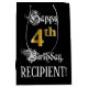 This elaborate and elegant birthday themed gift bag design features the message “Happy 4th Birthday,”, plus a custom recipient name. Part of the message is in a fancy script-style text, the large number “4th” features a faux/imitation gold-inspired look pattern, and the background is colored black. A luxurious birthday themed gift-bag like this might be a respectable way to wrap a gift or present being given to somebody who is celebrating their 4th birthday. [~Z0000560]