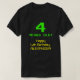 This nerdy and silly shirt design features the message "4 YEARS OLD!", the birthday greeting message "Happy 4th Birthday,", and a customizable name. The upper age digit and text feature a nerdy, green, pixelated, 8-bit graphics style appearance inspired by that of vintage computer games and classic video games. The lower greeting message has a geeky, yellow, vintage digital computing inspired look. Shirts like this might be worn by the guests of a birthday party held in celebration of somebody’s fourth birthday. [~Z0000455]