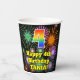 This fun and exciting birthday paper cup design features a large number “4” with a rainbow spectrum gradient inspired pattern, along with the message “Happy 4th Birthday,”, and a personalized name. The background features a multicolored pattern inspired by the appearance of bursting celebratory fireworks. Colorful, vibrant paper cups like this might be fun to have at a birthday party/celebration being held to honor somebody’s 4th birthday. [~Z0000539]