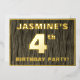 The front of this bold fourth birthday party foil invitation card features a custom name, a large number “4th”, the message “BIRTHDAY PARTY!”, and a border, all in foil. There is a rustic, yet sophisticated, faux wood grain look inspired pattern for the background of the front. The back features personalized details about the event, such as the date, time, location, and any other information that may be relevant. Customized invitations like these might be used to invite guests/attendees to a birthday gathering being held in celebration of somebody’s 4th birthday. [~Z0000598]