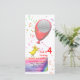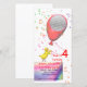 A birthday party invitation photocard with a little chicken holding a red balloon. Customizable text reads: Sue is turning 4! please join us for a birthday party, July 24, 1pm to 6pm, Sue's House, 4453 Neon Road, regrets to Joy (555) 555-5555. Add a photo of the birthday girl or boy!